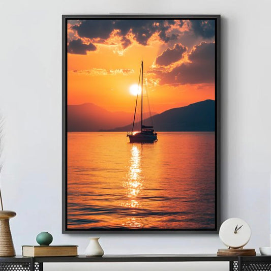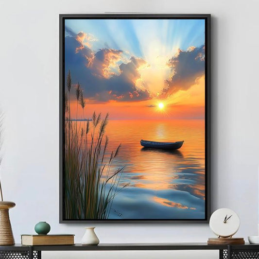 Peinture Sereine de Coucher de Soleil sur une Mer Calme avec Bateau et Roseaux